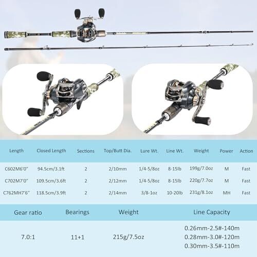 The baitcasting reel weighs 7.6 oz (215 g) and has line capacities of 0.26 mm / 140 m, 0.28 mm / 120 m, and 0.30 mm / 110 m, with a gear ratio of 7.0: