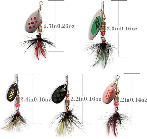 Includes rooster tail design with inline spinner blades and three-claw hooks.