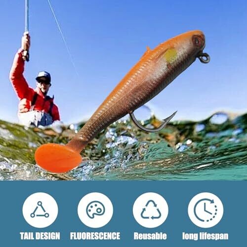 The product features a weighted soft plastic lure design that replicates natural prey movement in water, suitable for freshwater and saltwater use.