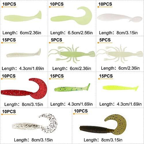 • Includes 115 pieces total: paddle tail swimbaits, grubs and luminous shrimp lures.