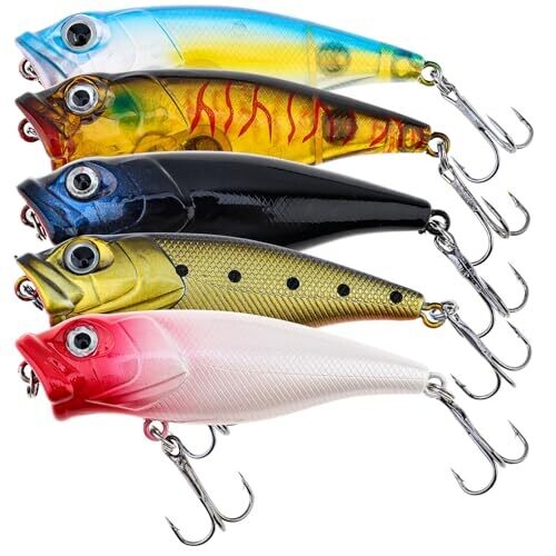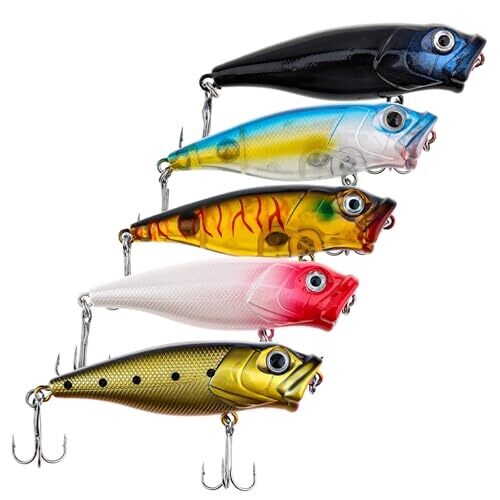 - Five-color set of topwater popper lures designed to attract bass with vibrant visuals and dynamic action.