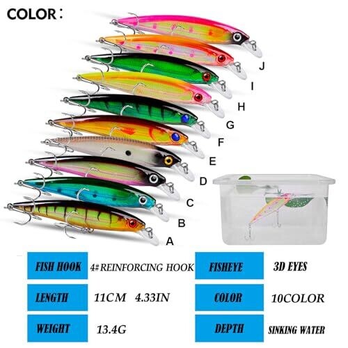 Premium 11 cm/13.4 g fishing lure kit designed for saltwater and freshwater use. Includes 10 colors to target bass, trout, pike and more. Features 3D lifelike texture, holographic eyes, corrosion-resistant sea-ready hooks, and long-cast precision.