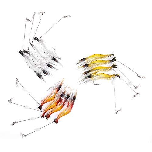 Lifelike shrimp-shaped soft lures with vibrant colors swim realistically to attract fish. Easy to use in freshwater or saltwater. Includes multiple soft silicone shrimp lures with hidden hooks for natural presentation and durable, flexible bodies with a luminous finish.