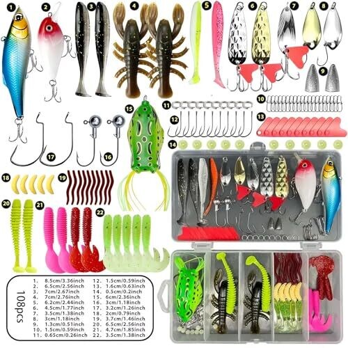 112 pieces; 22 different lure types (including crankbaits, topwater lures, soft plastics, spinners, jig heads, hooks and other accessories); materials include metal and soft plastic; suitable for both saltwater and freshwater usage; includes a tackle box for organized storage; designed for targeting bass, trout, walleye, salmon, musky, pike, bluegill, perch, crappie and panfish; features 3D eyes and realistic paintwork; durable and corrosion-resistant construction; compatible with a wide range of fishing environments and water depths.