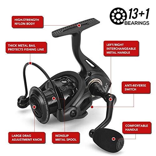 Lightweight CNC aluminum spinning reel optimized for saltwater and freshwater. 13+1 ball bearings provide smooth retrieves, hollow spool reduces weight, balanced design, easy-to-grip drag knob, interchangeable handle, and corrosion-resistant construction for durability.