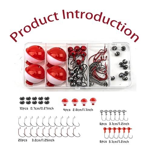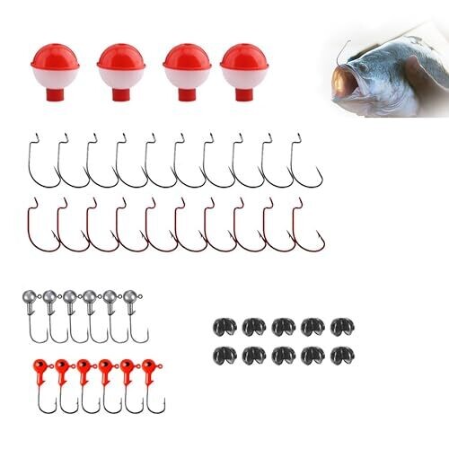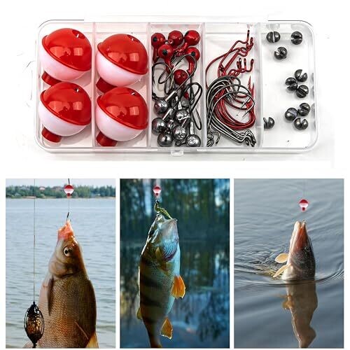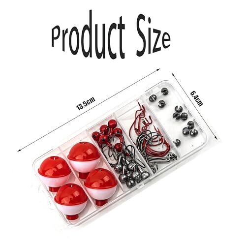 Portable and organized storage with a compact 5.3x2.52x1.02-inch plastic tackle box featuring 5 compartments to securely organize 46 fishing accessories; lightweight waterproof design suitable for freshwater and saltwater trips. The kit contains a 46-piece professional-grade assortment including 10 black crank hooks, 10 red crank hooks, 10 lead biting hooks, 6 3g primary color lead hooks, 6 3g red lead hooks, and 4 ball floats. Materials are high-carbon steel for enhanced hook strength and non-deformable bobbers to maintain buoyancy precision; components are saltwater-safe to resist rust. The dual-function design supports live bait with enhanced barb retention and artificial lures with circle hook optimization, with strategic float positioning to keep baits at strike-ready depths. The kit is effective across trout, bass, panfish, walleye, catfish, crappie and serves as a gift solution for beginners and experienced anglers alike.