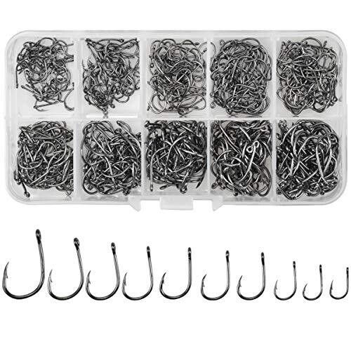 An all-in-one fishing set with 500 carbon steel hooks neatly organized in a detachable-compartment box. Six sizes No.3 to No.12 cover saltwater and freshwater rigs, with eyed hooks for quick setup and durable barbed points for improved bite and hookups.