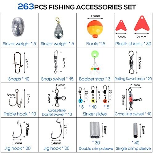• Expand your fishing versatility with a comprehensive 263-piece accessories set housed in a sturdy tackle box.