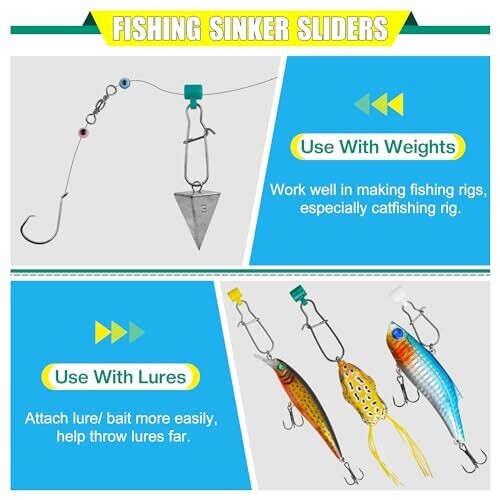 Excellent Material - The sinker slide with duo lock is made of stainless steel snaps and plastic sinker slide, reliable and tough, not easy to rust, corrode or deform. Various Rig - Great for any rigs required sling weight like, such as catfish rigs, striper rigs, surf rigs and deep water trolling. Practical function - Fishing line connector is designed to detect the slightest bite, your line slides freely without resistance of the leader, and the plastic sleeve helps the fishing line slide more smoothly. Ease to use - The sinker slider is easy to open and lock with a snap-on design, allowing the sinker to be replaced without dismantling the rig; suitable for freshwater and saltwater. Package and colors - 15/35/100 pieces of stainless steel fishing sinker slides, four colors available Black/Green/Blue/Transparent, with a transparent box for easy carry.