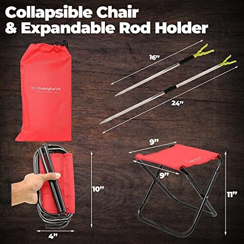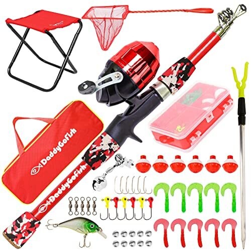 DaddyGoFish Fishing Pole – Telescopic Rod & Reel Combo with Chair (Red, 4)