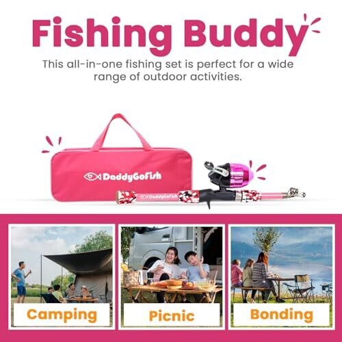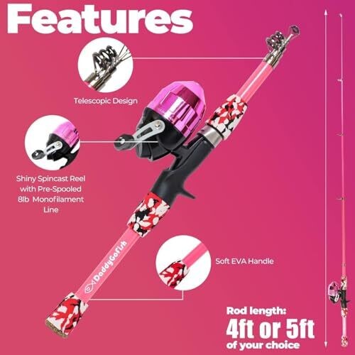 The product is the DaddyGoFish Kids Fishing Pole - Rod Reel Combo Tackle Box Starter Set, pink in color and approximately 4 feet in length.