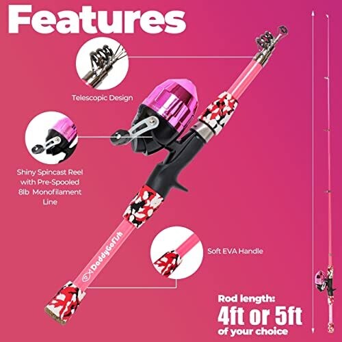 DaddyGoFish Kids Fishing Pole - Rod Reel Combo Starter Set, 5Ft (Older Kids, Pink)