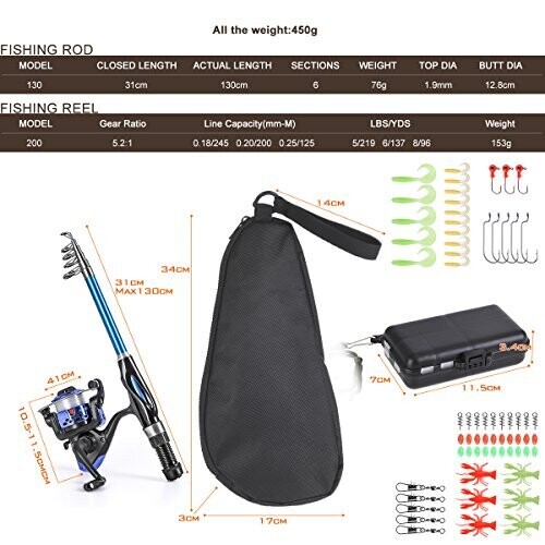 telescopic fishing rod, spincast reel, fishing line, tackle kit, lure case, and carry bag. Intended for youth and beginner anglers. Product title notes a rod length specification of 13ocm. Kit is designed for easy assembly and handling with a simple extend feature. Includes full kit and carry solution for storage and transport.