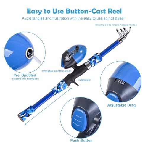 • All-in-one two-pack kids fishing rod sets in blue and orange for shared family fun.