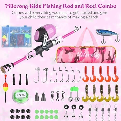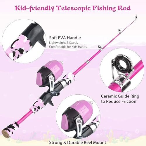 Milerong Kids Fishing Rod Kit, Telescopic Rod and Reel for Boys, Girls [Pink]