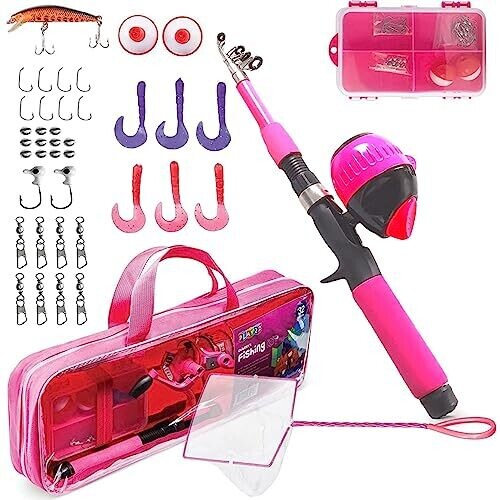 Play22 Kids Fishing Pole Pink set provides a complete, ready-to-use fishing experience for young anglers. The 65-inch telescopic rod folds compactly, includes a spincast reel, full tackle box, nets, lures, and a portable carry bag for easy travel and safe learning.
