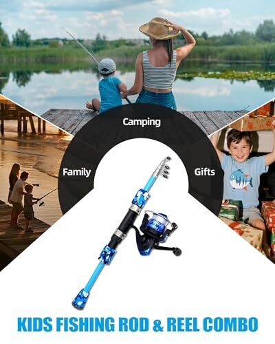 Complete fishing kit for kids including a telescopic rod, spinning reel, fishing line, and tackle gear with a carrying bag; rod length 1.25 meters with a camouflage EVA handle; includes 100 meters of nylon fishing line, a box of hooks and soft lures, suitable for ages 4-10; easy assembly with an easy-install spool and extend feature designed for beginners.