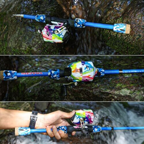The fishing rod is portable with a bright, colorful design and a soft EVA handle for a sturdy yet lightweight construction.