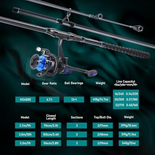 Sougayilang Surf Fishing Rod Combo IM8 Carbon 3-Piece Travel Rod 4000 Reel - 9' Lvs903Ko4000