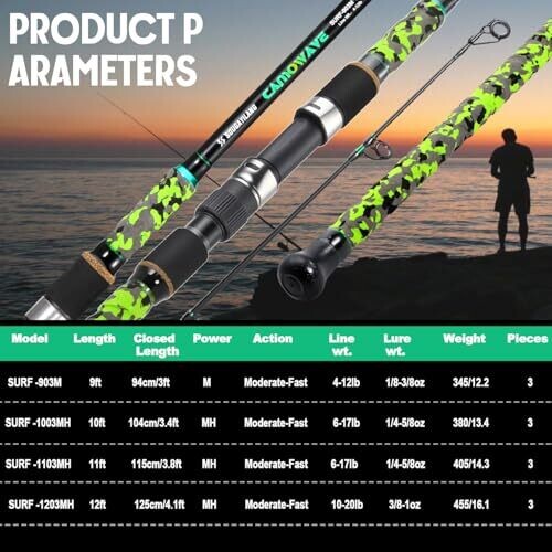 Sougayilang Surf Spinning Fishing Rod Carbon Travel Surf Rod M/MH 3-Piece Spinning Fishing Rod Green 9'