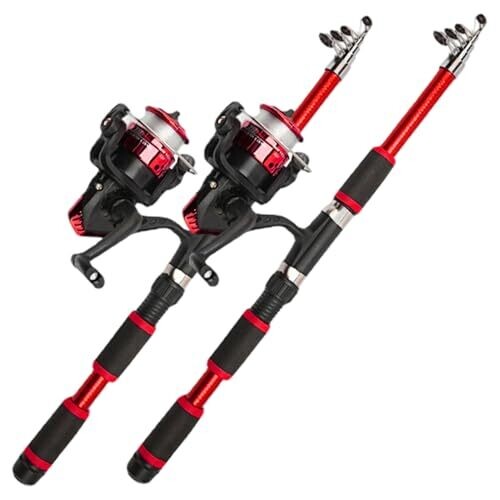 Two telescopic fishing rod and reel combinations are provided. Each rod is 6 ft in length and constructed from fiberglass. The design collapses for compact portability, facilitating travel, hiking, and spontaneous fishing trips. The reel is a spinning type, offering smooth casting and retrieval. The handle is non-slip to maintain a secure grip in wet conditions. The setup is intended for use in both saltwater and freshwater environments.