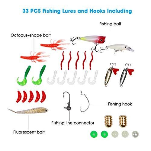 • Complete kit with reel, line, bag, lures, and hooks for immediate fishing.