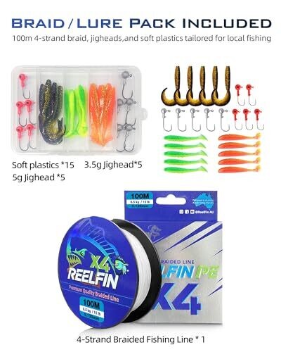 • Includes a 100m spool of REELFIN 4-strand braid, soft plastic and jighead kit, plus a compact tackle box.