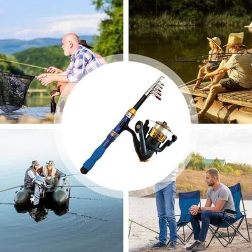 Compact travel fishing kit for freshwater and saltwater use. Telescopic fiberglass rod with a versatile reel, quick setup, and light, durable design. Includes carrier bag for easy transport and storage, plus reels, lures, hooks, lines, and essential accessories.