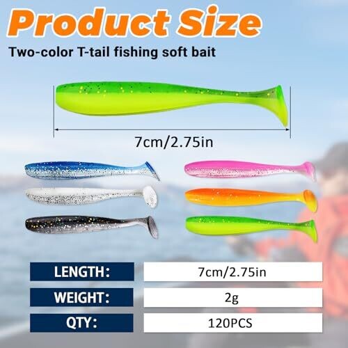 • 120-piece soft plastic swimbaits in six colors (black, gray, blue, pink, orange, green) for versatile fishing options