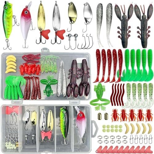 84-piece lure kit for saltwater and freshwater fishing, with a two-layer portable tackle box. Realistic lures trigger strikes, including crankbaits, soft worms, topwater, and metal spoons for bass, trout, and more.