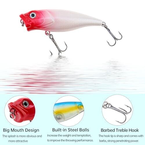 - Topwater popper action paired with ultra-sharp treble hooks for strong hooksets.
