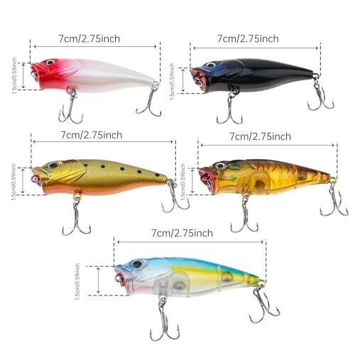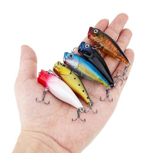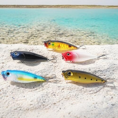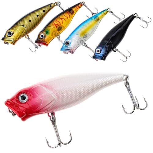 - Five-color set of topwater popper lures designed to attract bass with vibrant visuals and dynamic action.