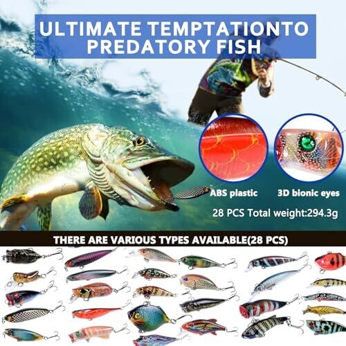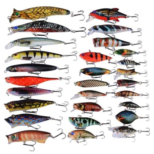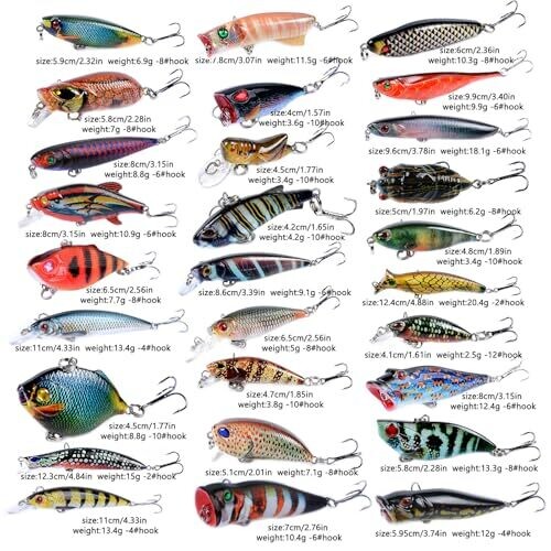 • Features 28 pieces in various sizes, including crank, popper, minnow, and vib lures, for versatile freshwater and saltwater fishing.