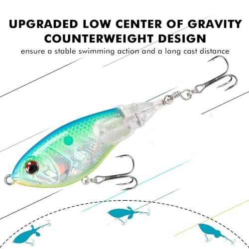 Additional weight on the belly improves balance and casting distance; during rapid, steady retrieval the rotating tail spins to splash water, attracting target fish.