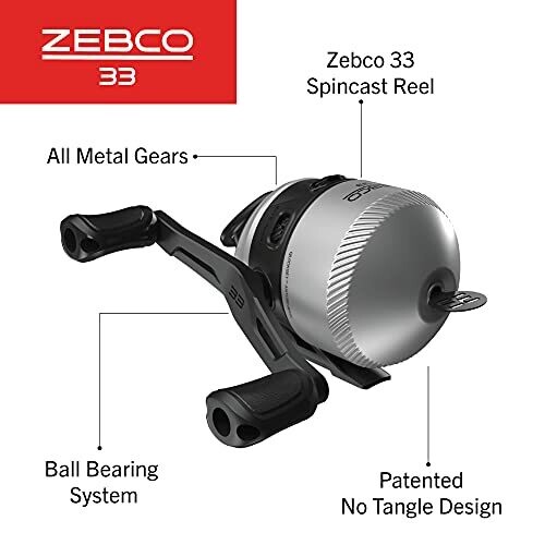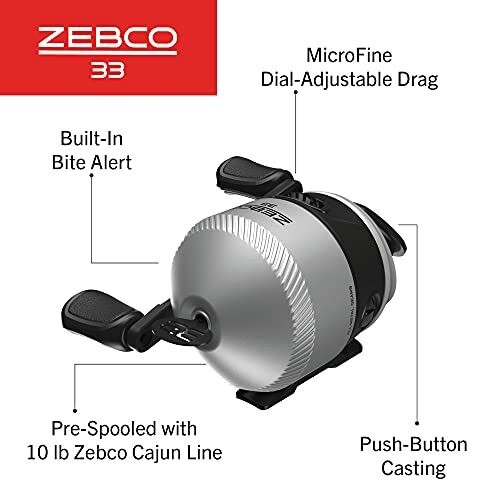 The Zebco 33 spincast reel size 30 features a lightweight graphite frame, stainless steel covers, and MicroFine dial-adjustable drag. It includes a built-in bite alert audio indicator and Quickset anti-reverse clutch. The reel has a 4.1: