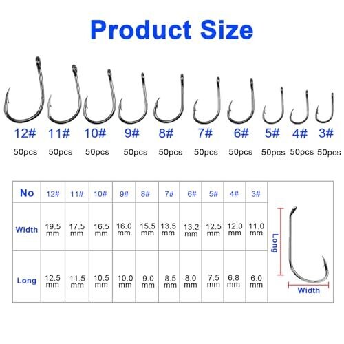 An all-in-one fishing set with 500 carbon steel hooks neatly organized in a detachable-compartment box. Six sizes No.3 to No.12 cover saltwater and freshwater rigs, with eyed hooks for quick setup and durable barbed points for improved bite and hookups.