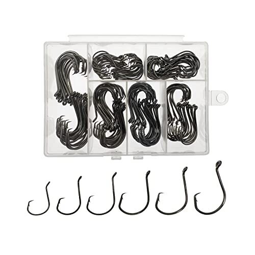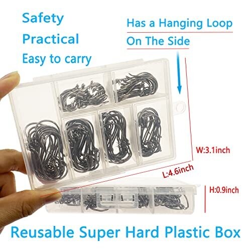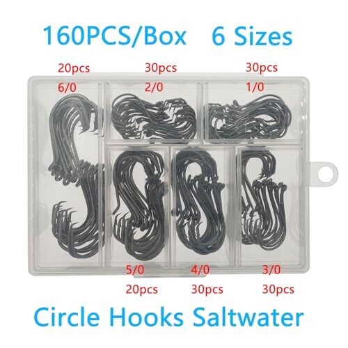 - All-in-one saltwater circle hooks set with 150pcs in six sizes (1/0, 2/0, 3/0, 4/0, 5/0, 6/0) housed in a reusable portable plastic box.