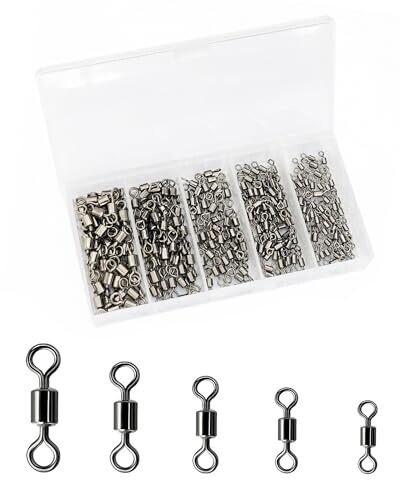 Premium 200-piece barrel swivel set in five sizes delivers durability and versatility for saltwater and freshwater. Stainless steel construction resists corrosion; smooth 360° rotation reduces line twists, keeping rigs neat. Includes organized storage box for easy on-spot selection.