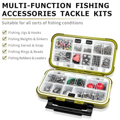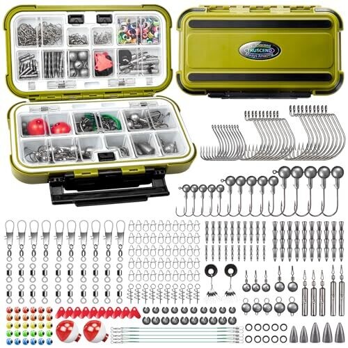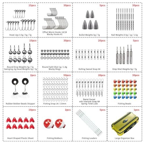 255 pieces. Contents include Jigs Head, fishing hooks, fishing weights and sinkers, fishing snaps and swivels, sinker slides, beads, rings, leaders, rubber bobber beads stopper, and related accessories.