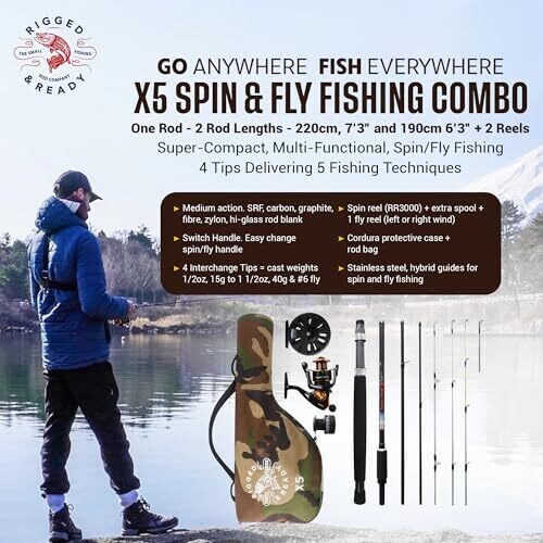 • Rigged & Ready Travel Fishing X5 Adventure Fishing Combo: 5 Rods In 1, Interchangeable Spin, Fly and Bait Reels, British Design