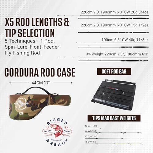 Rigged & Ready Travel Fishing X5 Adventure Fishing Combo: 5 Rods In 1, Interchangeable Spin, Fly and Bait Reels, British Design
