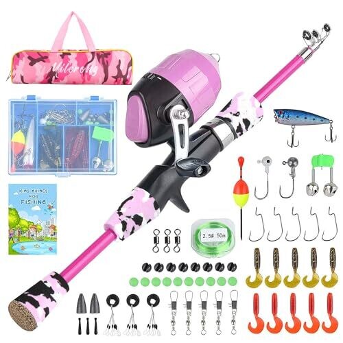 Milerong Kids Fishing Rod Kit, Telescopic Rod and Reel for Boys, Girls [Pink]