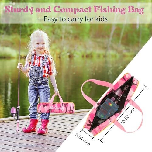 - All-in-one fishing kit designed for kids with a telescopic rod, a spincast reel, line, lures, tackles, and a carry bag