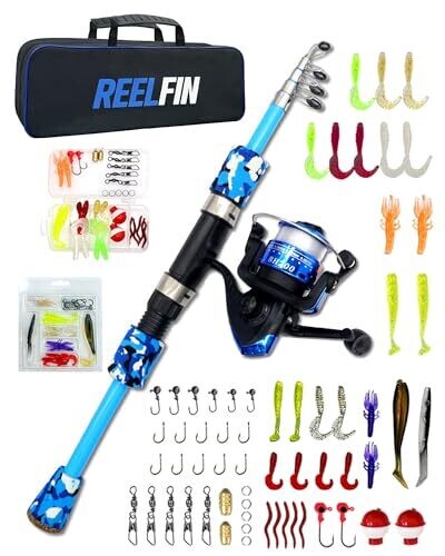 • Reelfin Spinning Fishing Pole for Kids – Telescopic Rod & Reel Combo, Tackle Box (Blue)