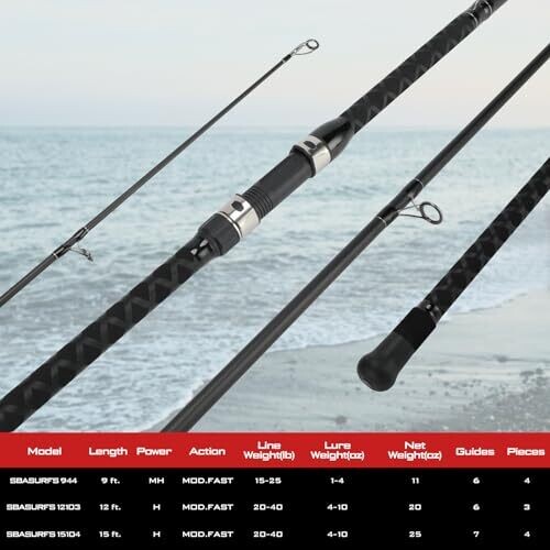 surf fishing rod for saltwater use; available as 3-piece or 4-piece configurations with lengths 9 ft, 12 ft, and 16 ft.