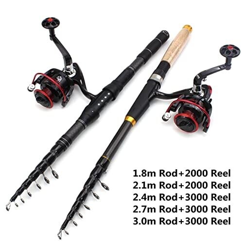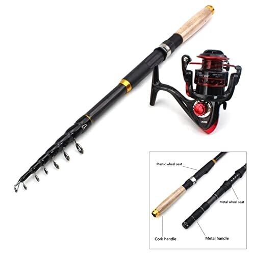 Carbon Fiber Telescopic Fishing Rod 1.8M 2.1M 2.4M 2.7M 3.0M Portable Spinning Rod and Reels Set (Color: Black Metal Handle, Size: 2.4 M)