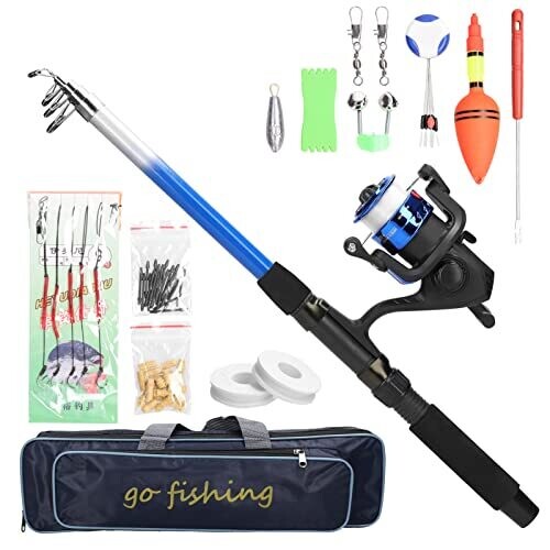 • Includes spinning reel, fishing line, hooks, lures, and a storage bag for a complete setup.