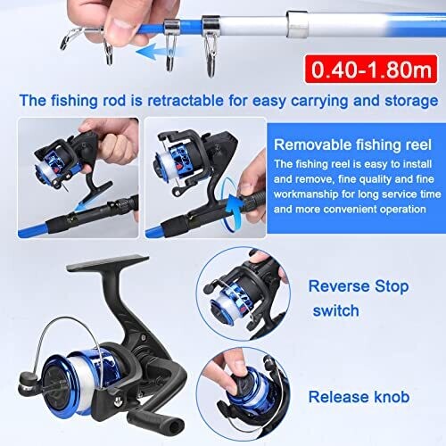 • Telescopic fishing rod and reel set designed for portability and ease of use.