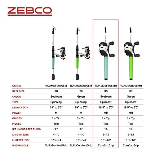 • Marketing-friendly Zebco Roam Spincast Reel and Telescopic Fishing Rod Combo designed for the on-the-go angler.